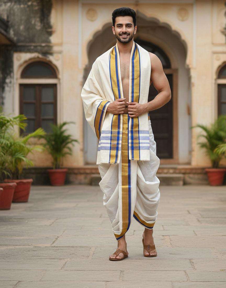 Price range: ₹2,250.00 through ₹2,580.00SaleTemple Elegance Dhoti – 1” Ganga Jamuna Border 450 y